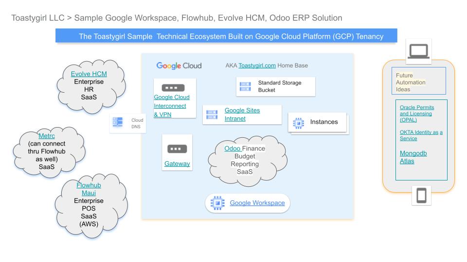 I call this diagram the Birthday Cake ERP Solution recipe. It’s for a small Adult Use Recreational Dispensary with 2-5 locations and delivery services. The infrastructure reminds me of a birthday cake – it’s got the base cake layer, in this example it’s the Google Cloud (or OCI or AWS) Tenancy that houses the business end of operations and acts as a data repository for the organization. The GCP/base layer is a great foundation for whatever toppings or “applications” that you want to add on top of the cake. In the case of this example, for my “toppings” I chose a SaaS POS vendor, a SaaS HCM vendor, an IaaS vendor for integration, and a SaaS ERP vendor hosted on GCP. I’ve included Google Workspace (easy breezy) for business operations, and some storage and instances for building the future. It uses Google products for communications and integrations, Google Infrastructure, and has the flexibility of “subscription” type SaaS applications – it’s literally going to the marketplace and choosing what’s in season and is the best.
